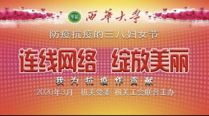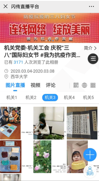 在全国上下共同抗击新型冠状肺炎疫情这个特殊时期,为庆祝“三八”国际劳动妇女节,丰富女职工文化生活,维护女职工身心健康,展现女职工防控疫情、共克时艰的良好精神风貌,营造积极向上的氛围,按照学校党委关于做好疫情期间学校有关工作的部署和校工会的指导意见,机关党委、机关工会采取线上展示反映女职工在抗击疫情期间健康向上的生活状态和工作状态的音像、图文作品的方式,开展以“我为抗疫作贡献”为主题的网络庆祝活动。截止3月7日共征集到美图作品156幅,视频作品6部,作品内容精彩纷呈,全方位反映了机关女职工奋战抗疫第一线的感人事迹,以及学习、健身、养生、摄影、书法、文艺、厨艺、园艺、亲情等各种才艺展示的健康积极、丰富多彩的居家疫期生活状态,充分展现机关巾帼事业家庭两肩挑、使命责任勇担当的风采。8号当天的网络活动现场气氛热烈,机关党委和机关工会通过QQ群、微信群向全体机关女职工致以节日问候,大家在群里相互传递节日祝福与鼓励,欣赏上传到群里的精彩作品,彼此分享工作、学习、生活中的感动与欢乐,作品在闪传直播平台浏览量不到半天时间就超过了3千人次。