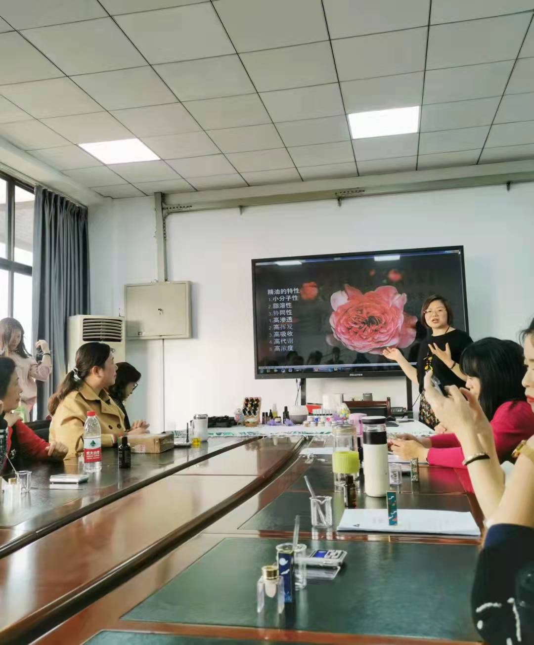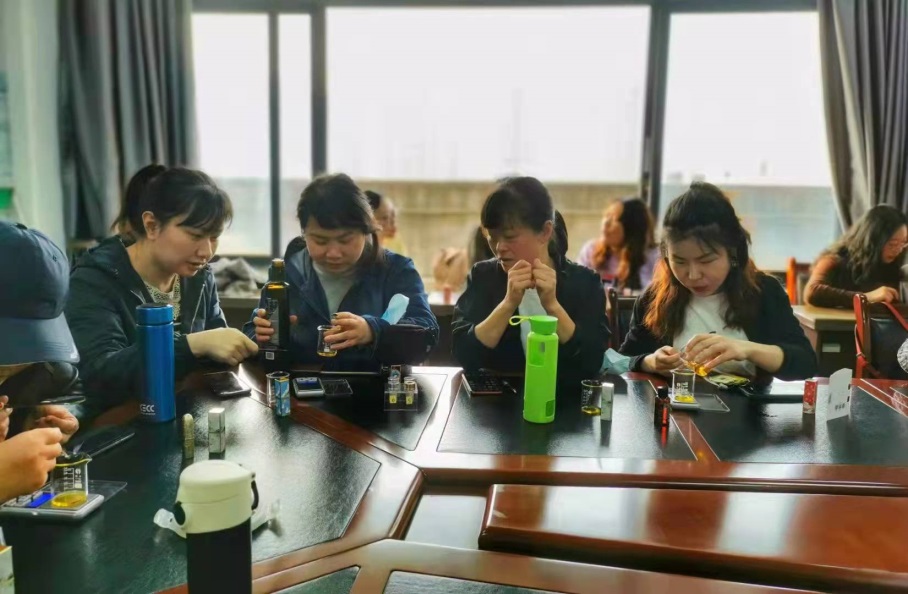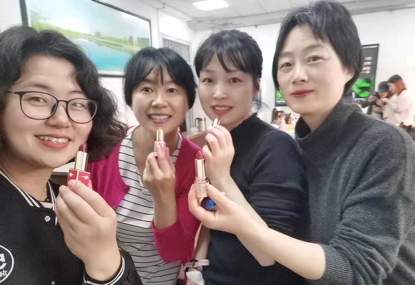 活动开始,手工老师从精油的相关知识讲起,演示了精油的妙用,大家在亲身体验后,都啧啧称奇,感慨精油给身心带来的愉悦感受;第二项活动是“DIY精油口红”,大家看着桌子上的瓶瓶罐罐都充满了好奇,早已跃跃欲试,橄榄油、色素、蜂蜡、VE、定型模具、搅拌棒、计量秤……遵循老师的指导、示范,大家纷纷拿出上化学实验课的精细劲儿,按照步骤将天然材料称量、搅拌、加热融化、倒入磨具、冷却脱模,看似简单的过程,却需要一双双纤纤玉手小心翼翼的才能完成,活动现场热闹非凡,学员们不仅学得用心,也玩得开心,看着自己精心完成的漂亮好看又很实用的完美作品,在属于自己的节日里亲手给自己制作一份专属的独特礼物,为生活添加一抹亮丽的颜色,大家都满意极了。