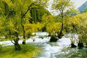 九寨沟四季景色都十分迷人。春时嫩芽点绿,瀑流轻快;夏来绿荫围湖,莺飞燕舞;秋至红叶铺山,彩林满目;冬来雪裹山峦,冰瀑如玉。 九寨沟动植物资源丰富,种类繁多,原始森林遍布,栖息着大熊猫等珍贵野生动物。