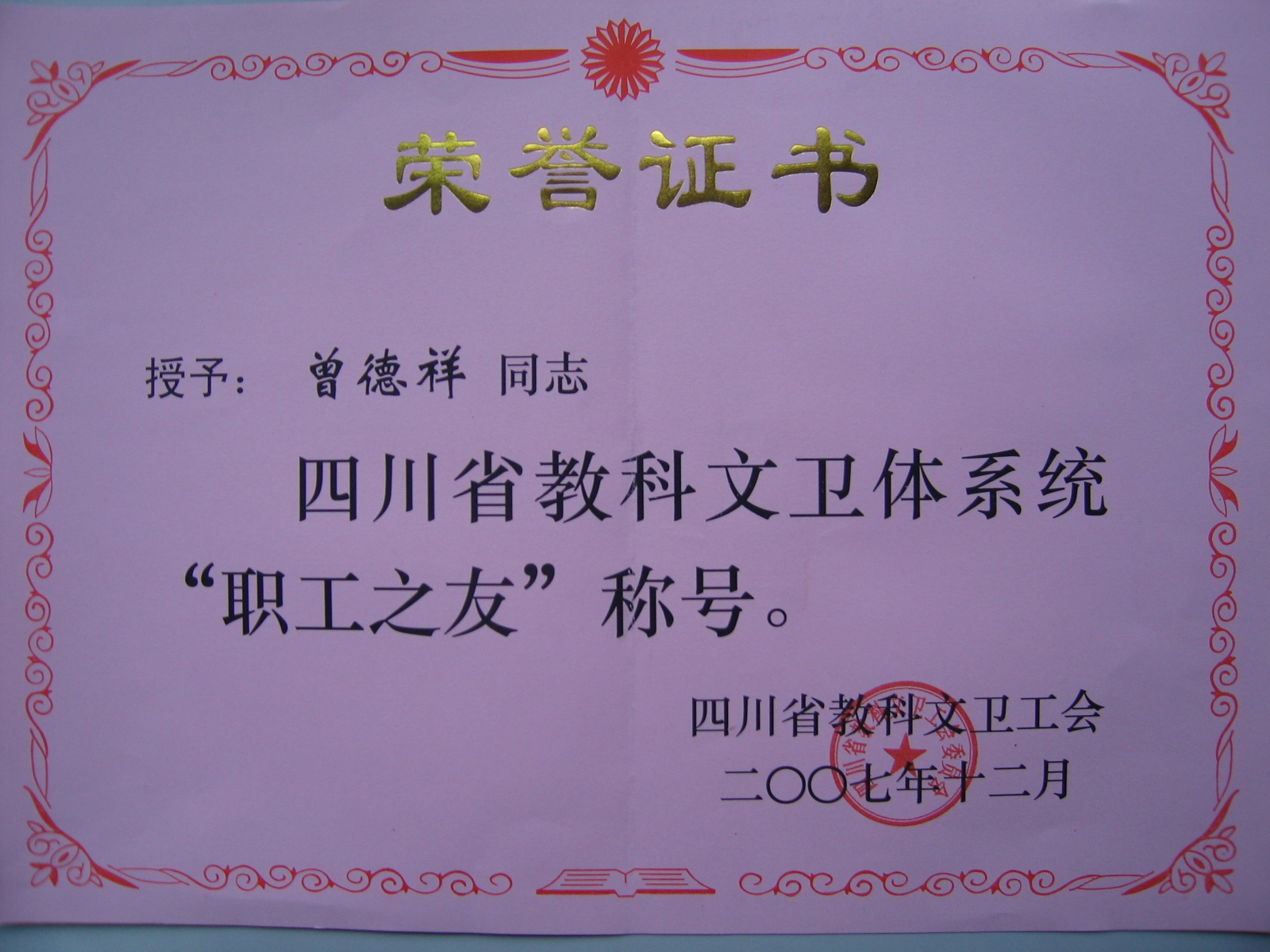 校党委副书记曾德祥被评为四川省教科文卫体系统“职工之友”