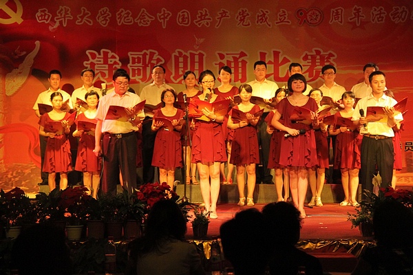 能容纳四百余人的学生活动中心人山人海,座无虚席。近百名教职工党员满怀对党的热爱之情,奉献了二十六首红色经典诗歌,高度弘扬了共产党好、社会主义好、伟大祖国好、改革开放好、各族人民好的主旋律。饱满的热情,激昂的旋律,铿锵有力的朗诵,共产党九十年的历程仿佛如一幅画卷,缓缓展现在师生的眼前。经济与贸易学院全体教工党员朗诵的《走向纪念碑》,人南校区代表队朗诵的《青春中国》,离退休总支代表队朗诵的《我骄傲,我是中国人》,机关第三分工会代表队朗诵的《党赞》等节目给现场观众留下了深刻的印象。
