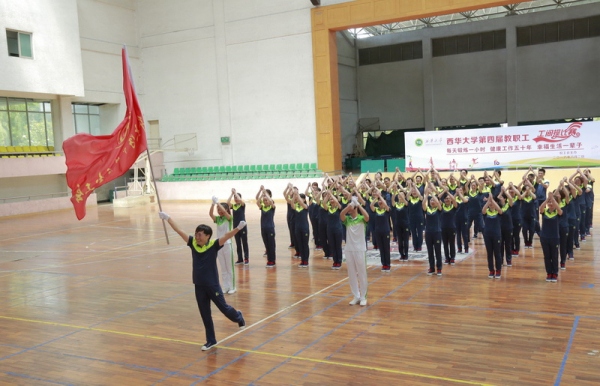 紧接着上场的建设与管理工程学院参赛队别出心裁,默契感十足的他们戴着统一的白手套,在空中划出一个个完美的弧线。学院领导全体上阵的理学院参赛队的表演带着一种深沉美,合手、打开、出脚、收脚,一致的动作,劲道中又渗透着轻柔之美。计算机与软件工程学院参赛队的柔美、人文学院参赛队的活力美、由刘清友校长亲自举旗、朱晋蜀副校长参加比赛而掀起高潮的机关三分工会参赛队、食品与生物工程学院参赛队的从容淡定都给观众留下了深刻印象。