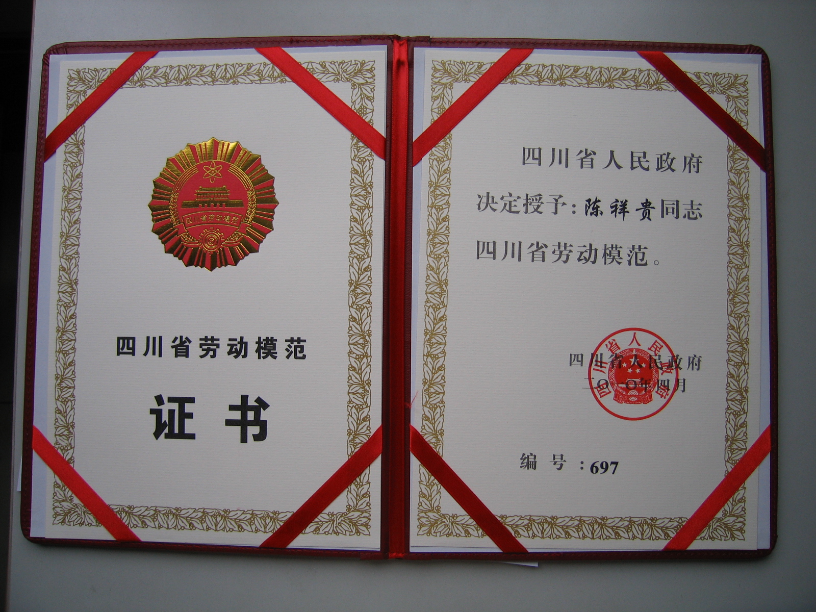 2010年4月,四川省政府授予生物学院教师陈祥贵“四川省劳动模范”。