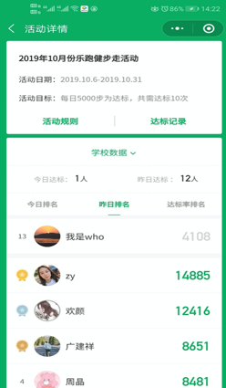 4.可点击活动,查看每天的数据排名和达标记录数据。