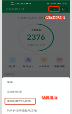 1.搜索“乐跑教职工”小程序后,为方便能在微信首页通过下拉方式快速进入,可以按如下方式把小程序添加到我的小程序。