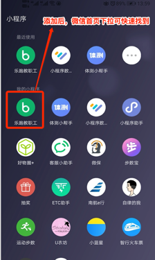 1.搜索“乐跑教职工”小程序后,为方便能在微信首页通过下拉方式快速进入,可以按如下方式把小程序添加到我的小程序。