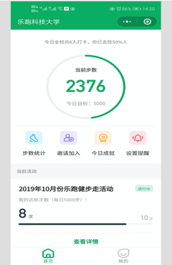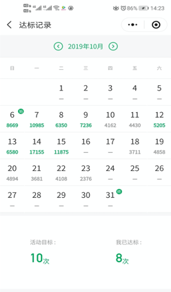 3.活动要求:以天为单位统计步数,当天累计8000步及以上算一次有效运动。活动期内,累计有效运动达40次即为完成活动目标。